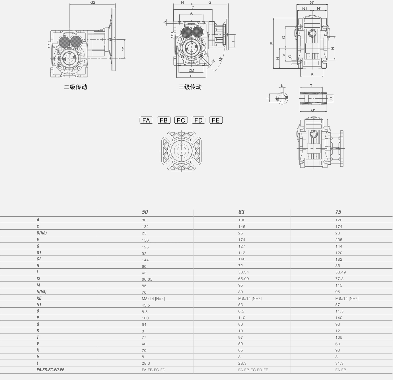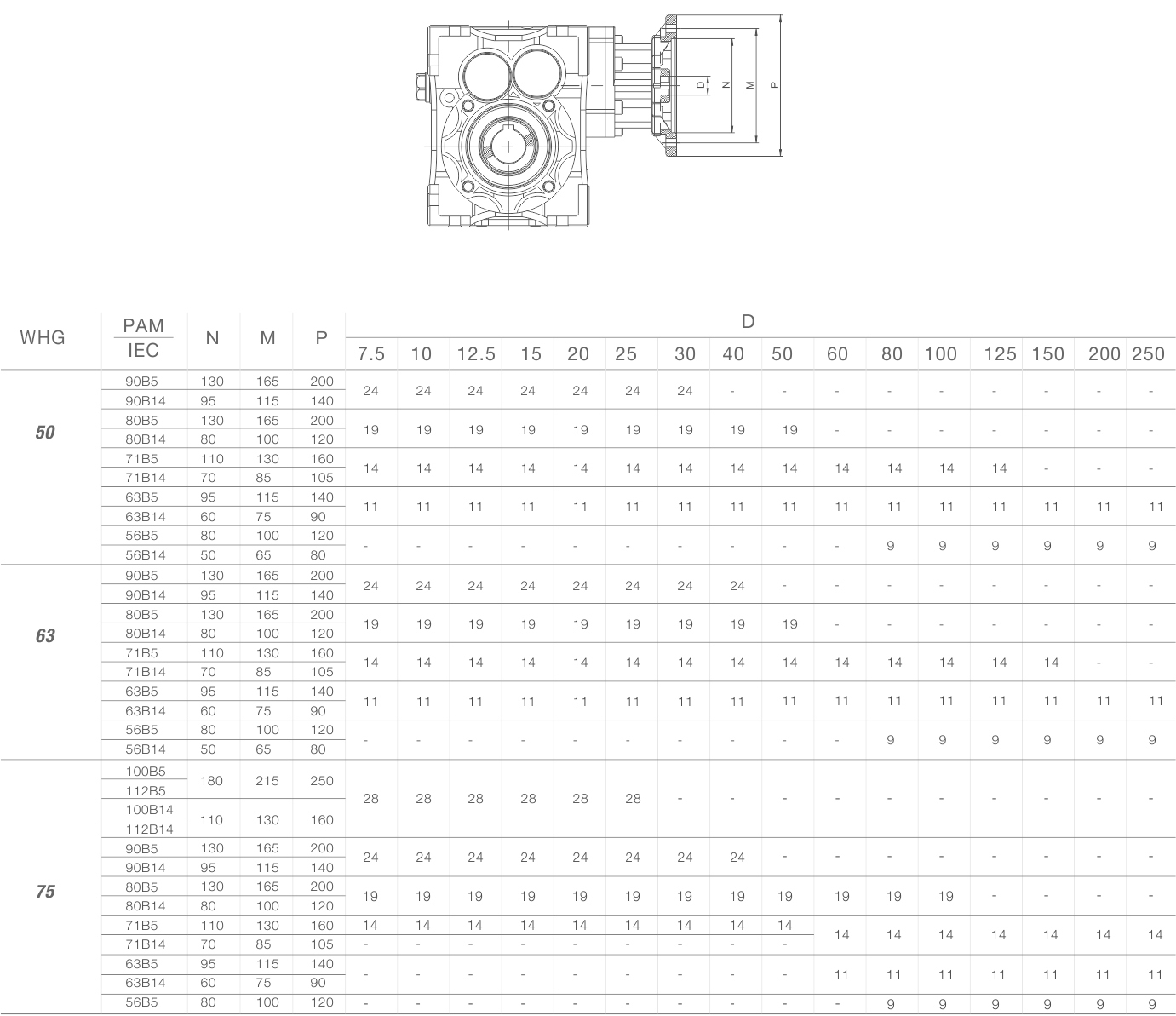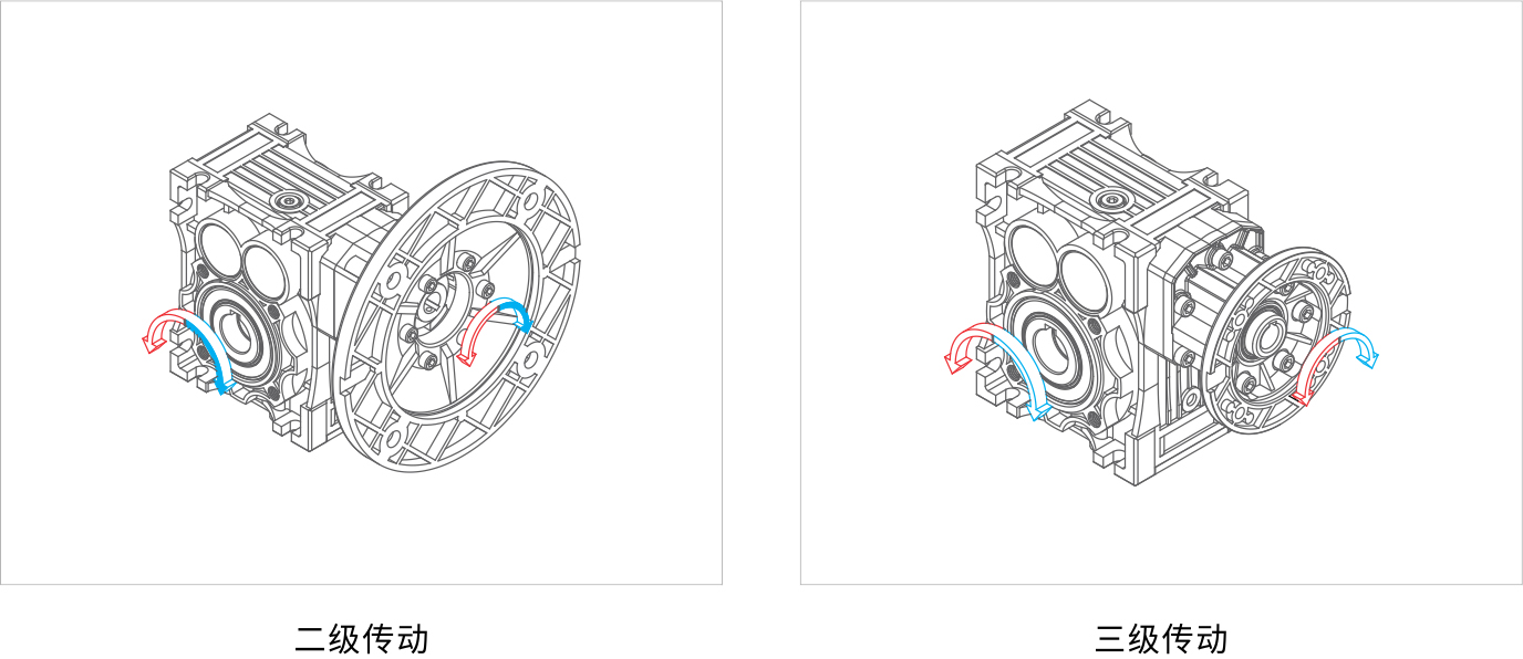 WHG系列減速器有50-63-75三種規(guī)格。速比7.5~60采用二級傳動,速比80~300采用三級傳動。